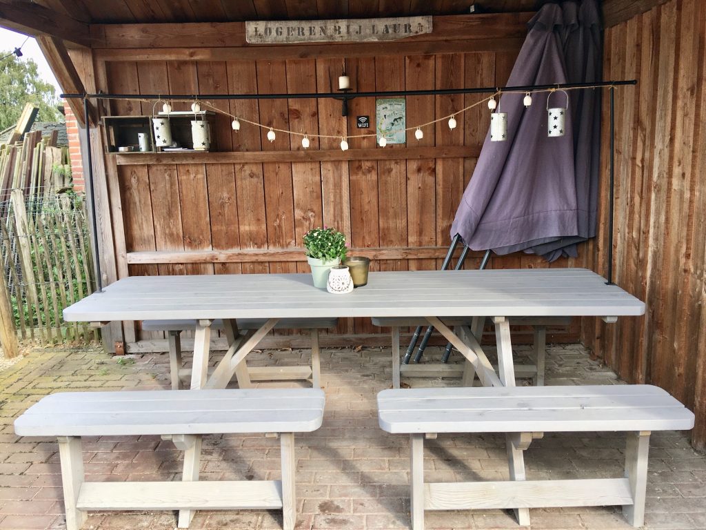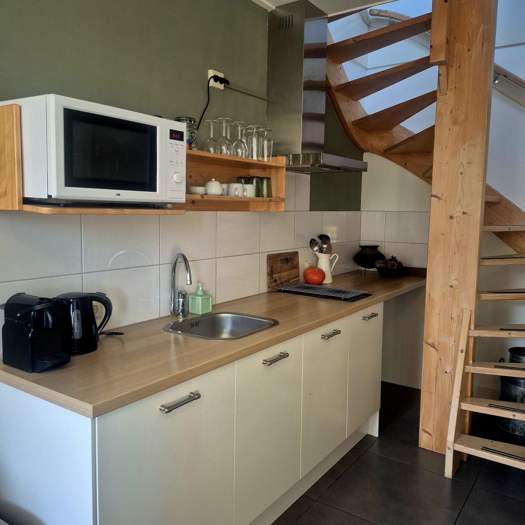De vakantiewoning beschikt over een gezellig en compleet ingerichte woon-eetkeuken, de keuken bevat 2 kookpitten, een Nespresso, waterkoker, pannen, servies en bestek, linnengoed en een combi oven magnetron, en een koelkast met vriesvak. De badkamer en toilet zijn beneden, de slaapkamers bevinden zich op de eerste en tweede etage. Het bed is een tweepersoons van 160×200, met twee eenpersoons 4 seisoenen dekbedden, het bed is uiteraard heerlijk fris opgemaakt bij aankomst. Op de zolder staan nog 2 eenpersoonsbedden. Er zijn geen deuren tussen de verdiepingen. De handdoeken voor de badkamer liggen in de kast (1 set per persoon is inbegrepen). Er is een eigen tuintje met tuinset en parasol waar je vrij kan zitten, de fietsen kunnen veilig gestald in de kapschuur die afgesloten is. Uw auto kunt u veilig bij ons op het erf parkeren.